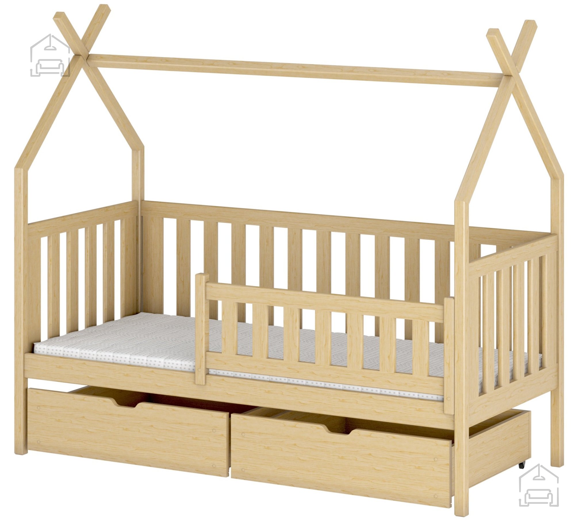 Sodobna otroška postelja z dodatnim ležiščem je namenjena fantom in deklicam. Otroška postelja je narejena tako, da združuje funkcionalnost, modernost in predvsem kakovost in varnost za vašega otroka, ker ima močen okvir iz bora. Praktične dimenzije zagotavljajo, da postelja ne zasede veliko prostora, zato je več prostora za igranje ali učenje. Otroška postelja je narejena iz borovega lesa. Postelja ima prostor za shranjevanje v obliki dveh predalov.