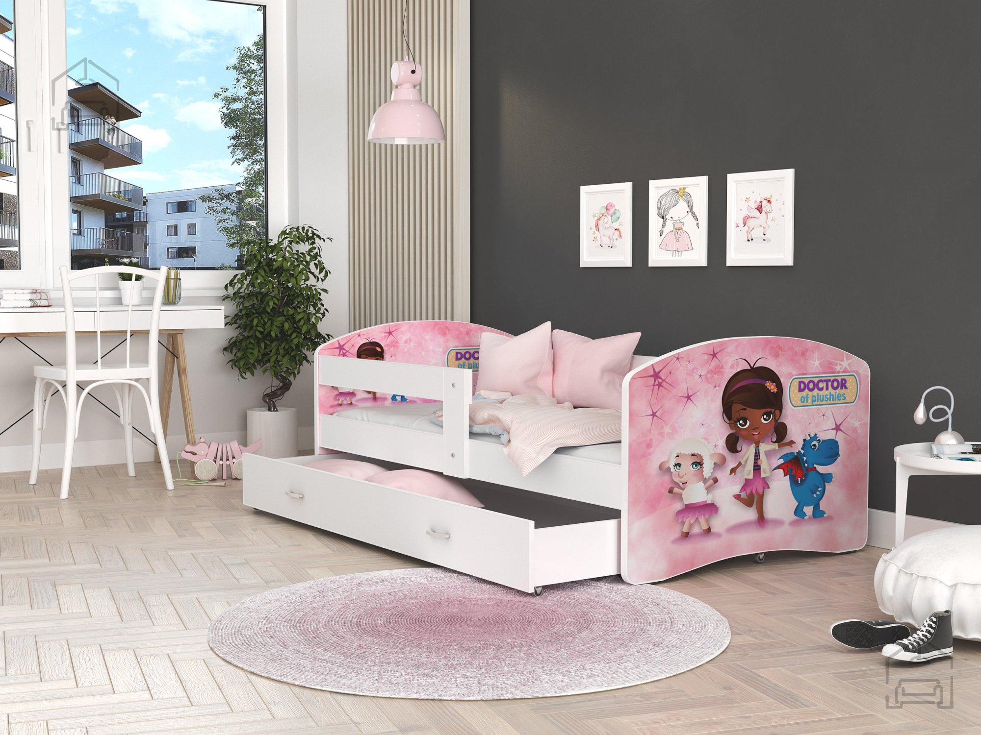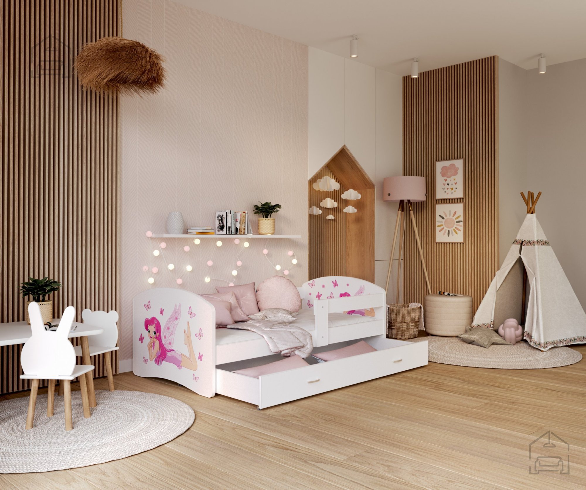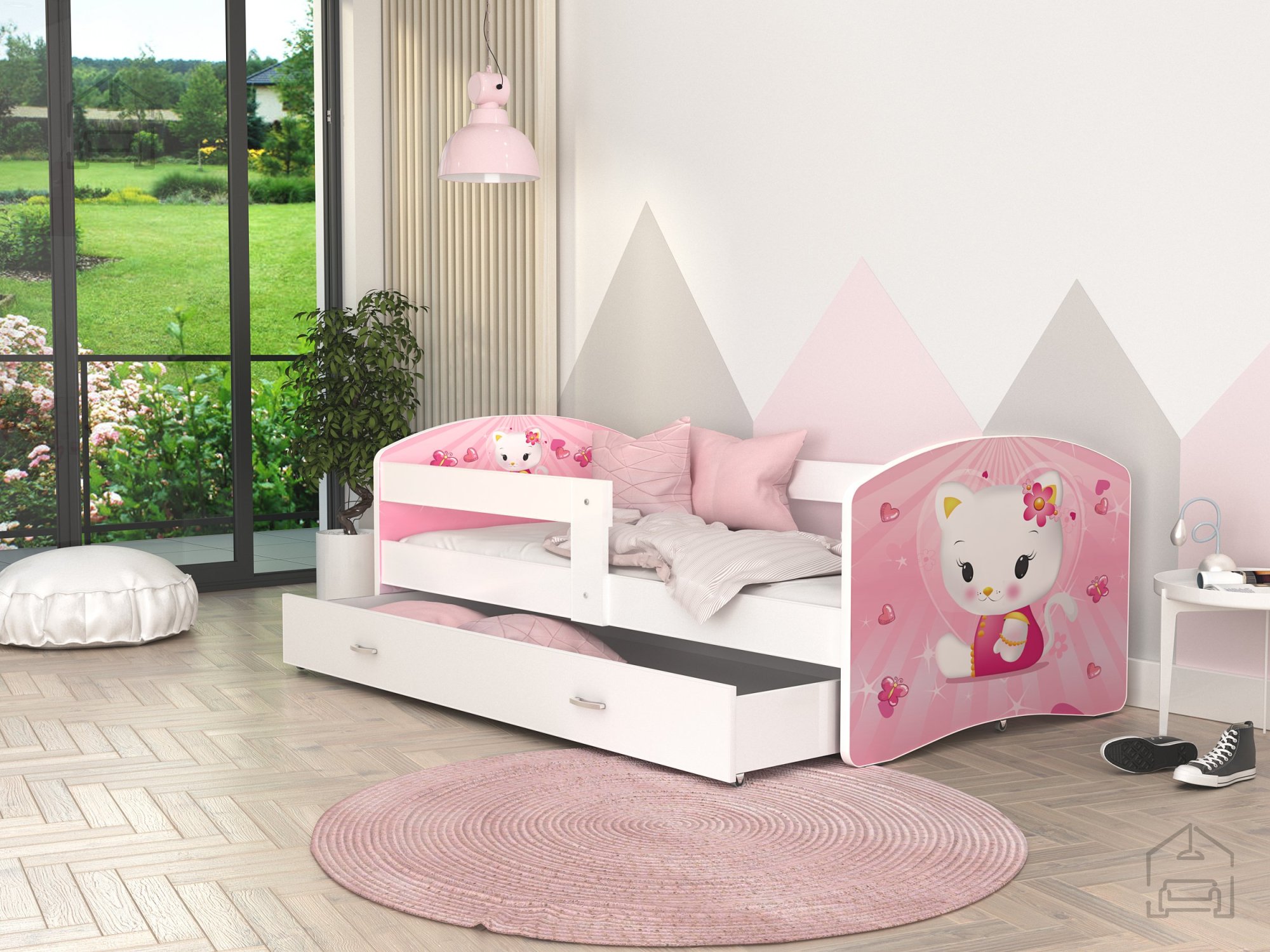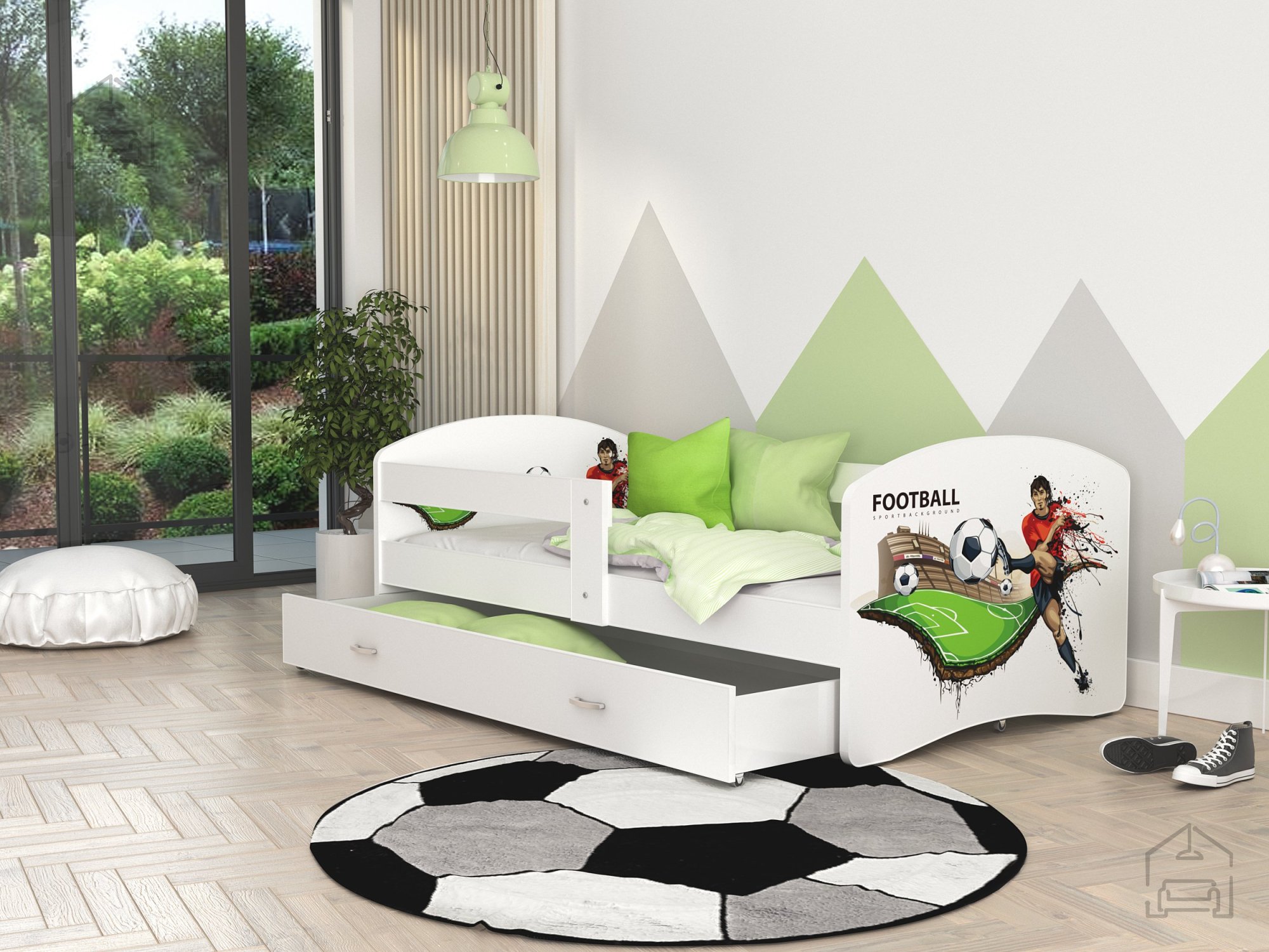 Postelja je narejena tako, da združuje funkcionalnost, modernost in predvsem kakovost. Otroška postelja s predalom za posteljnino in poslikavo. | Ležalna površina: 90x200 cm