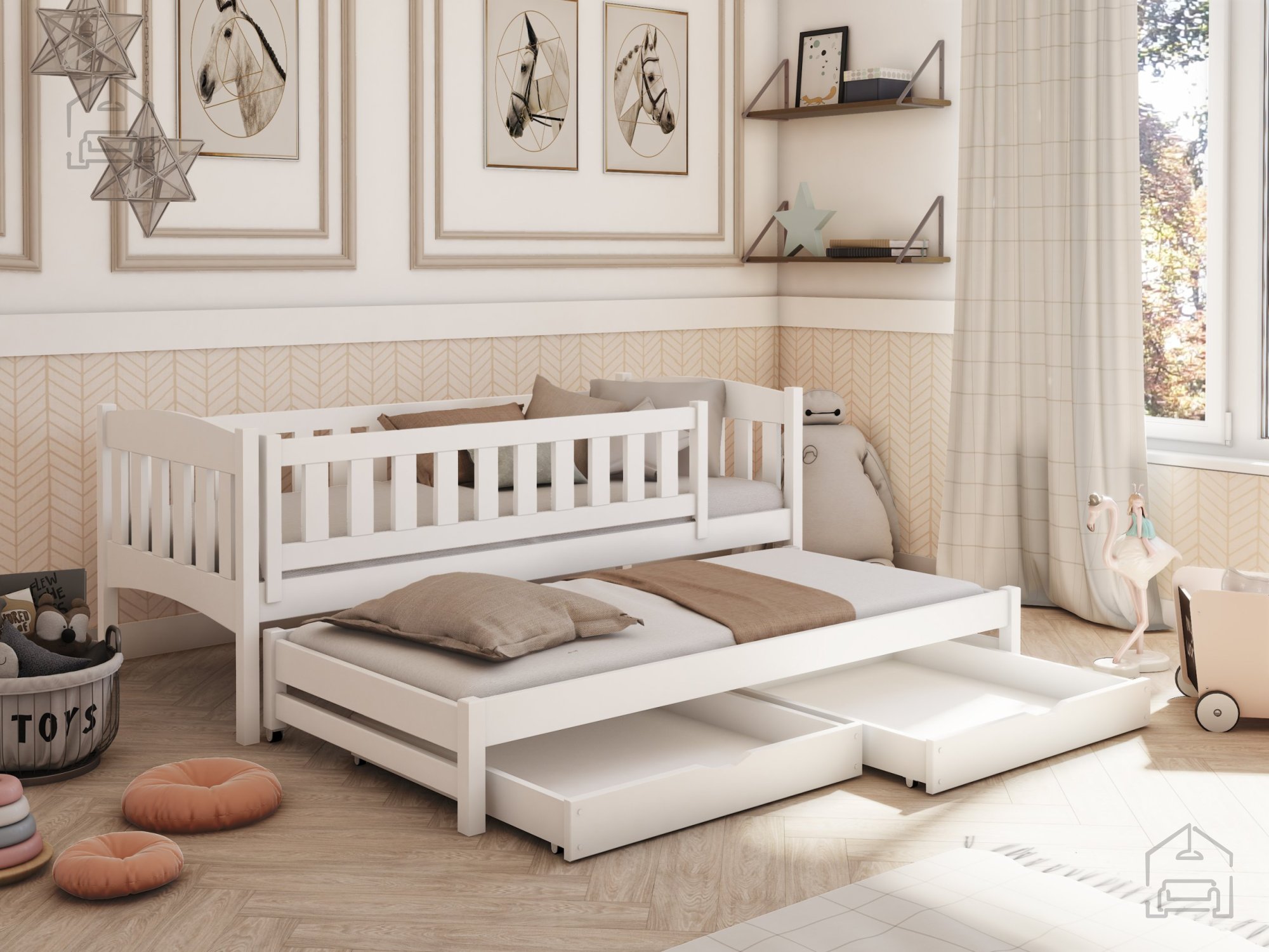 Sodobna otroška postelja z dodatnim ležiščem je namenjena fantom in deklicam. Otroška postelja je narejena tako, da združuje funkcionalnost, modernost in predvsem kakovost in varnost za vašega otroka, ker ima močen okvir iz bora. Praktične dimenzije zagotavljajo, da postelja ne zasede veliko prostora, zato je več prostora za igranje ali učenje. Otroška postelja je narejena iz borovega lesa. Postelja ima prostor za shranjevanje v obliki dveh predalov. | Material korpusa: Laminirana plošča