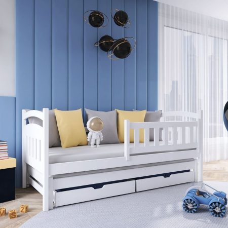 Sodobna otroška postelja z dodatnim ležiščem je namenjena fantom in deklicam. Otroška postelja je narejena tako, da združuje funkcionalnost, modernost in predvsem kakovost in varnost za vašega otroka, ker ima močen okvir iz bora. Praktične dimenzije zagotavljajo, da postelja ne zasede veliko prostora, zato je več prostora za igranje ali učenje. Otroška postelja je narejena iz borovega lesa. Postelja ima prostor za shranjevanje v obliki dveh predalov. | Material korpusa: Laminirana plošča