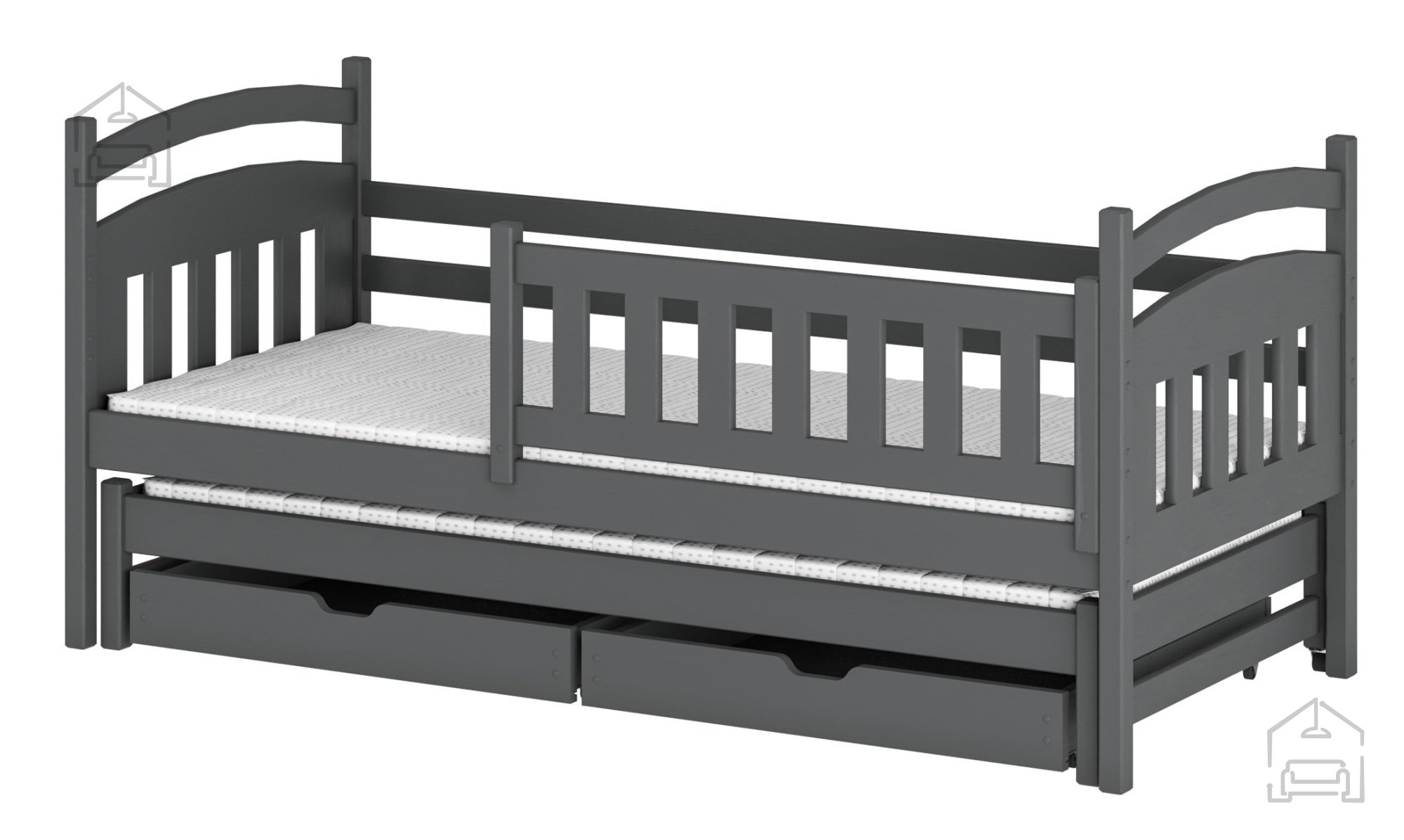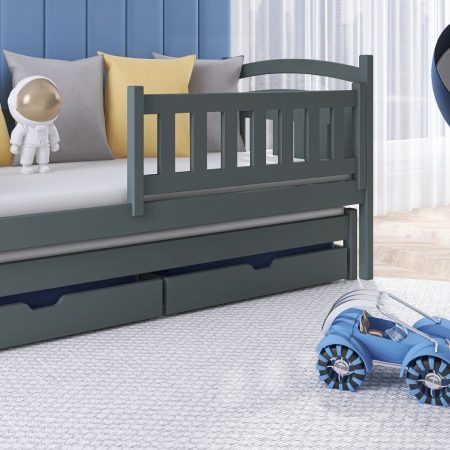 Sodobna otroška postelja z dodatnim ležiščem je namenjena fantom in deklicam. Otroška postelja je narejena tako, da združuje funkcionalnost, modernost in predvsem kakovost in varnost za vašega otroka, ker ima močen okvir iz bora. Praktične dimenzije zagotavljajo, da postelja ne zasede veliko prostora, zato je več prostora za igranje ali učenje. Otroška postelja je narejena iz borovega lesa. Postelja ima prostor za shranjevanje v obliki dveh predalov. | Ležalna površina: 90x200 cm