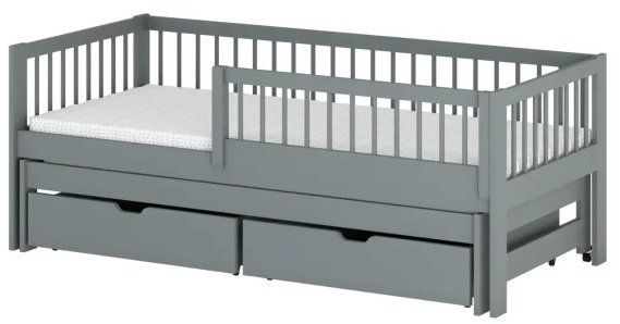 Otroška postelja z dodatnim ležiščem Softi - 90x190 cm - siva je popolna izbira za starše, ki iščejo kakovostno, varno in estetsko privlačno posteljo za svoje otroke. Njene funkcionalnosti, kot so dodatni predali, možnost odstranitve pregrade in trpežna izdelava, zagotavljajo dolgotrajno zadovoljstvo in udobje. Investirajte v prostor, kjer bo vaš otrok z veseljem spal, sanjal in se igral. | Material: laminirana plošča
