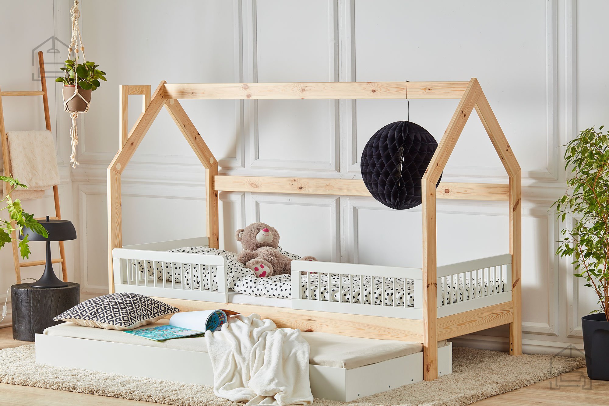 Sodobna otroška postelja z dodatnim ležiščem je namenjena fantom in deklicam. Otroška postelja je narejena tako, da združuje funkcionalnost, modernost in predvsem kakovost in varnost za vašega otroka, ker ima močen okvir iz bora. Praktične dimenzije zagotavljajo, da postelja ne zasede veliko prostora, zato je več prostora za igranje ali učenje. Otroška postelja je narejena iz borovega lesa. Postelja ima prostor za shranjevanje v obliki dveh predalov. | Material: Iveral