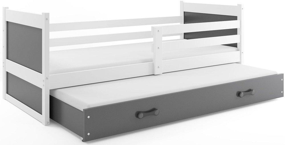 Sodobna otroška postelja z dodatnim ležiščem je namenjena fantom in deklicam. Otroška postelja je narejena tako, da združuje funkcionalnost, modernost in predvsem kakovost in varnost za vašega otroka, ker ima močen okvir iz bora. Praktične dimenzije zagotavljajo, da postelja ne zasede veliko prostora, zato je več prostora za igranje ali učenje. Otroška postelja je narejena iz borovega lesa. Postelja ima prostor za shranjevanje v obliki dveh predalov. | Material: tkanina/masiven les