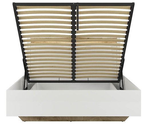 - Okvir postelje je opremljen z plinskimi dvigali in prostornim zabojnikom za posteljnino, kar omogoča priročno shranjevanje in izrabo prostora.