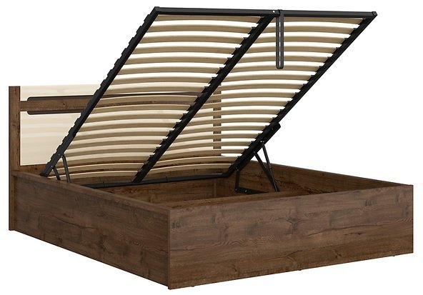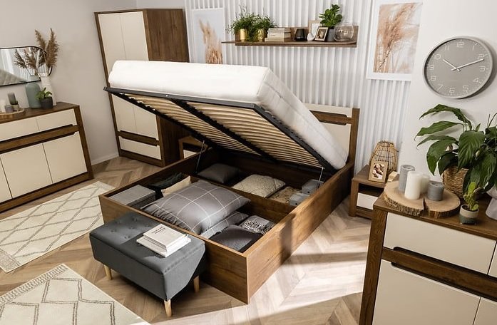 Postelja ima dvignjen okvir na plinskih dvigalih. To omogoča enostaven dostop do spodnjega prostora za posteljnino, kar je zelo praktično za shranjevanje posteljnine in drugih predmetov.