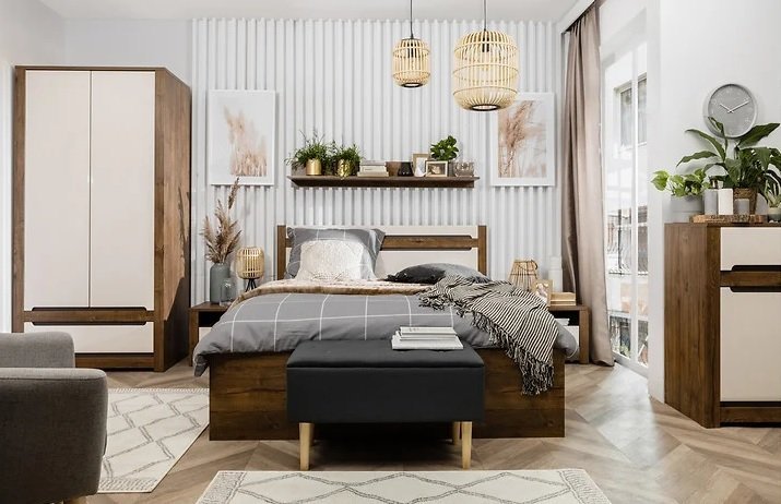 Moderen komplet pohištva Venlo je ovlikovana v zanimivih oblikah kar je tudi povdarjeno z barvami in bo odlično pohištvo za vašo spalnico. Komplet ima vse kar bi potrebovali za opremo spalnice . | Material: Iveral