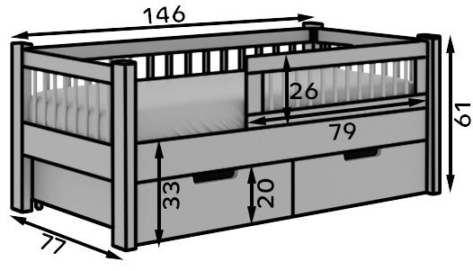 Sodobna postelja z dodatnim ležiščem je namenjena fantom in puncam. Narejena je tako, da združuje funkcionalnost, modernost in predvsem kakovost in varnost za vašega otroka, ker ima močen okvir iz bora. Praktične dimenzije zagotavljajo, da postelja ne zasede veliko prostora, zato je več prostora za igranje ali učenje. Otroška postelja je narejena iz borovega lesa. Postelja ima prostor za shranjevanje v obliki dveh predalov. | Material: tkanina, les