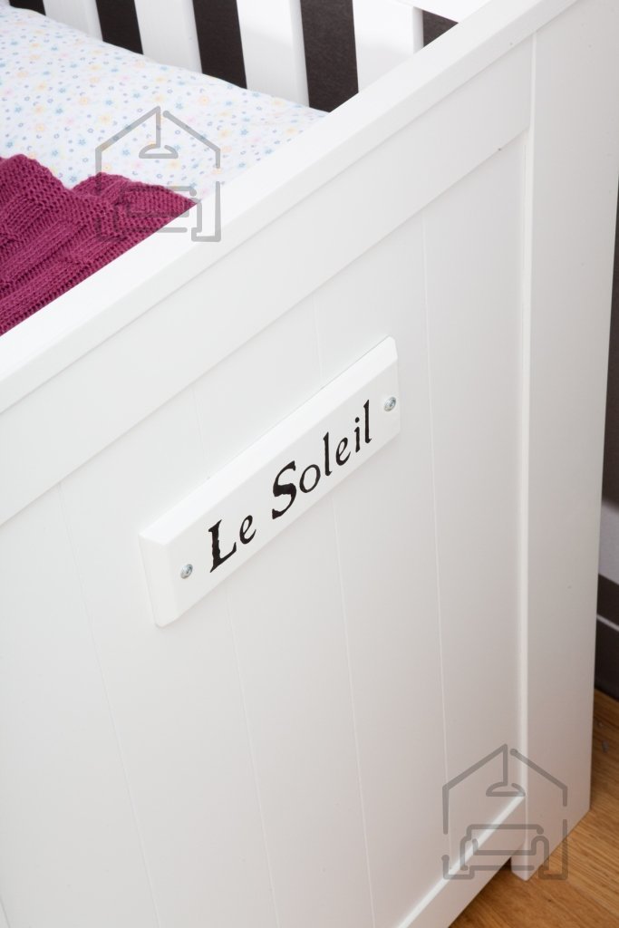 - Postelja je okrašena s ploščico z napisom "Le Soleil" (sonce), ki postane značilen element celotnega kompleta Marsylia.
