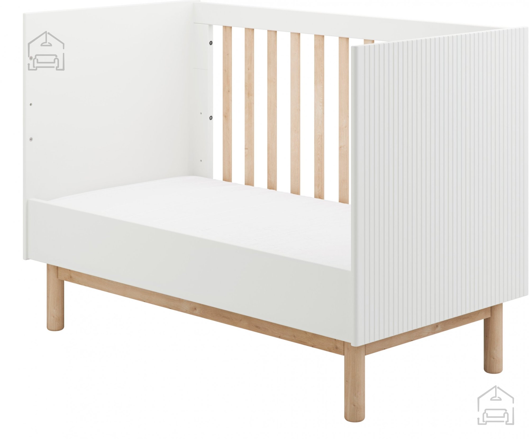 Vzmetnica ni vključena v cenoDimenzije: 660x874x1236 mm Elegantna posteljica Miloo, zasnovana za vzmetnico velikosti 120x60 cm, izstopa po svoji vsestranskosti in prilagodljivosti rastočim potrebam otroka. Ponaša se s tremi nivoji nastavitve višine vzmetnice in tremi odstranljivimi prečkami za lažji dostop. Ena izmed inovativnih lastnosti je možnost odstranitve ene stranice posteljice, kar omogoča prilagoditev, ko otrok raste.