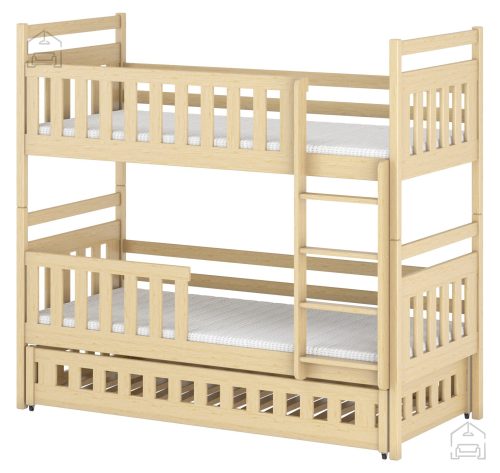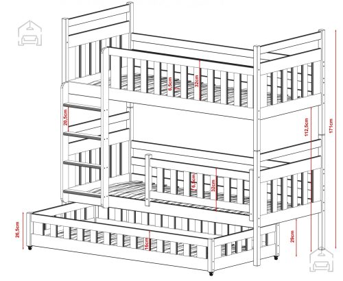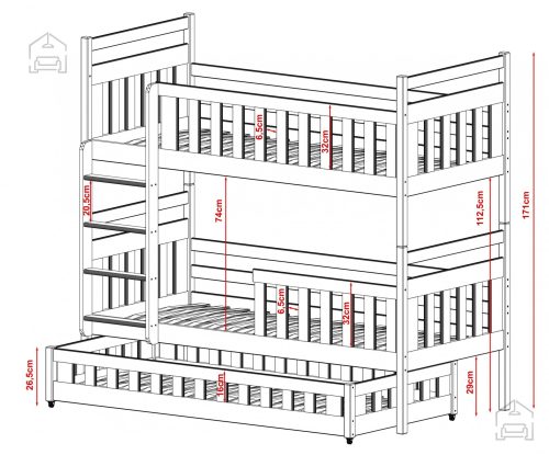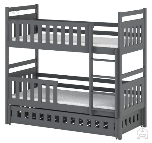 Sodobna otroška postelja z dodatnim ležiščem je namenjena fantom in deklicam. Otroška postelja je narejena tako, da združuje funkcionalnost, modernost in predvsem kakovost in varnost za vašega otroka, ker ima močen okvir iz bora. Praktične dimenzije zagotavljajo, da postelja ne zasede veliko prostora, zato je več prostora za igranje ali učenje. Otroška postelja je narejena iz borovega lesa. Postelja ima prostor za shranjevanje v obliki dveh predalov. | Ležalna površina: 80x160 cm