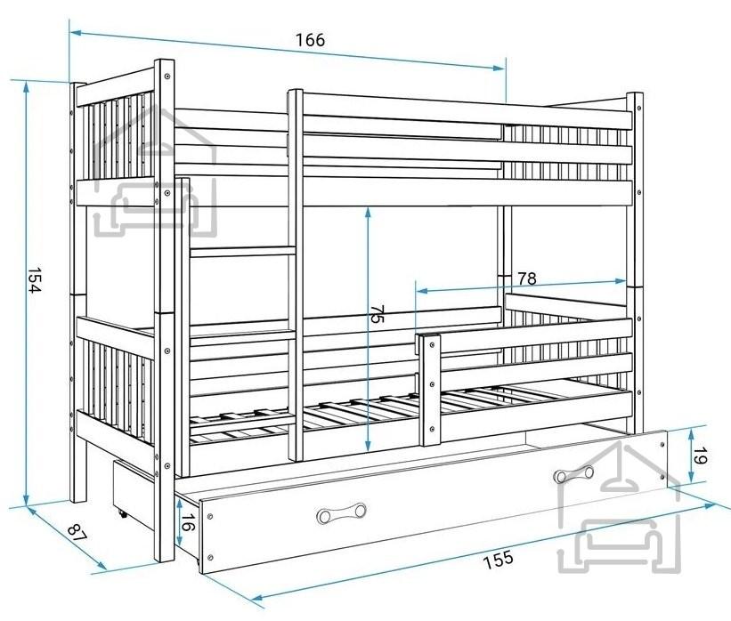Sodobna postelja z dodatnim ležiščem je namenjena fantom in puncam. Narejena je tako, da združuje funkcionalnost, modernost in predvsem kakovost in varnost za vašega otroka, ker ima močen okvir iz bora. Praktične dimenzije zagotavljajo, da postelja ne zasede veliko prostora, zato je več prostora za igranje ali učenje. Otroška postelja je narejena iz borovega lesa. Postelja ima prostor za shranjevanje v obliki dveh predalov.