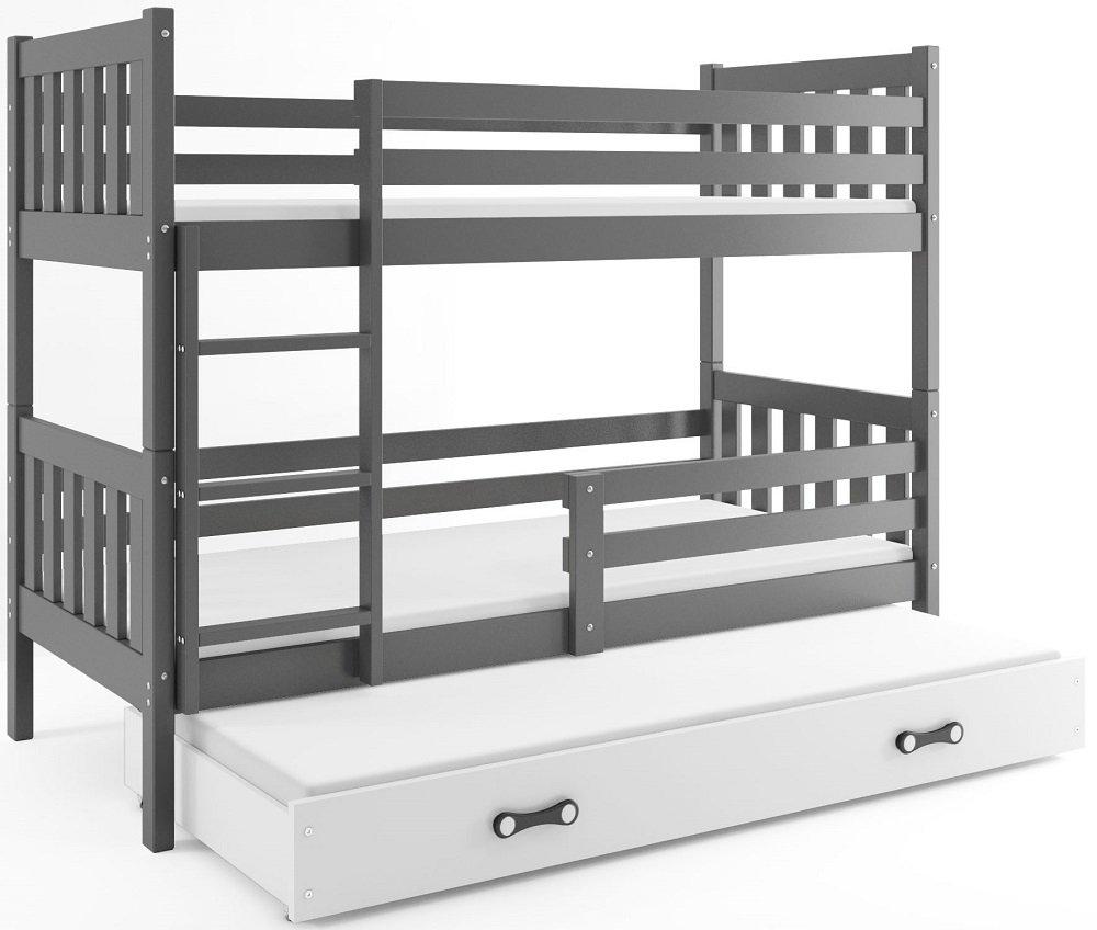 Sodobna otroška postelja z dodatnim ležiščem je namenjena fantom in deklicam. Otroška postelja je narejena tako, da združuje funkcionalnost, modernost in predvsem kakovost in varnost za vašega otroka, ker ima močen okvir iz bora. Praktične dimenzije zagotavljajo, da postelja ne zasede veliko prostora, zato je več prostora za igranje ali učenje. Otroška postelja je narejena iz borovega lesa. Postelja ima prostor za shranjevanje v obliki dveh predalov. | Material: tkanina, les