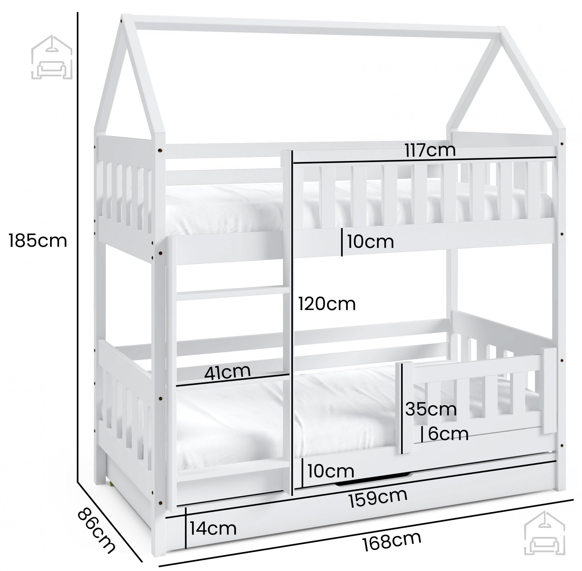 Sodobna otroška postelja z dodatnim ležiščem je namenjena fantom in deklicam. Otroška postelja je narejena tako, da združuje funkcionalnost, modernost in predvsem kakovost in varnost za vašega otroka, ker ima močen okvir iz bora. Praktične dimenzije zagotavljajo, da postelja ne zasede veliko prostora, zato je več prostora za igranje ali učenje. Otroška postelja je narejena iz borovega lesa. Postelja ima prostor za shranjevanje v obliki dveh predalov. | Ležalna površina: 75x180 cm