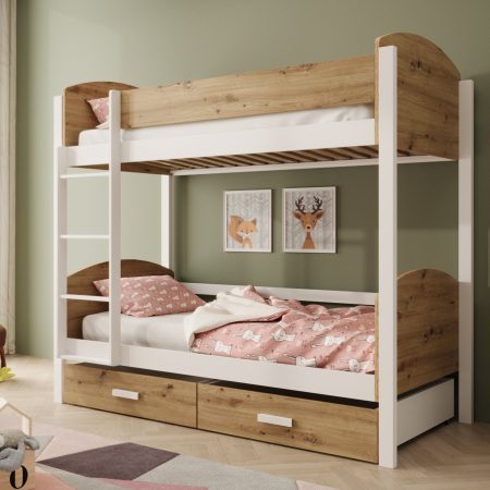 Ključna prednost pograda Jori je njegova premišljena zasnova, ki nudi udobje in praktičnost. S svojo ležalno površino 90x200cm omogoča prijeten spanec za dve osebi, kar je idealno za družine z več otroki ali za pogosto gostovanje prijateljev. Poleg tega sta dva prostorna predala pod spodnjo posteljo popolna rešitev za shranjevanje posteljnine, igrač, oblačil ali drugih otroških dodatkov. Tako bo otroška soba vedno urejena in organizirana.