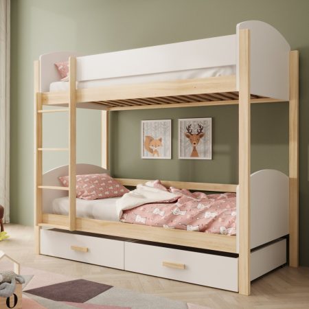 Sodobna otroška postelja z dodatnim ležiščem je namenjena fantom in deklicam. Otroška postelja je narejena tako, da združuje funkcionalnost, modernost in predvsem kakovost in varnost za vašega otroka, ker ima močen okvir iz bora. Praktične dimenzije zagotavljajo, da postelja ne zasede veliko prostora, zato je več prostora za igranje ali učenje. Otroška postelja je narejena iz borovega lesa. Postelja ima prostor za shranjevanje v obliki dveh predalov. | Ležalna površina: 75x180 cm