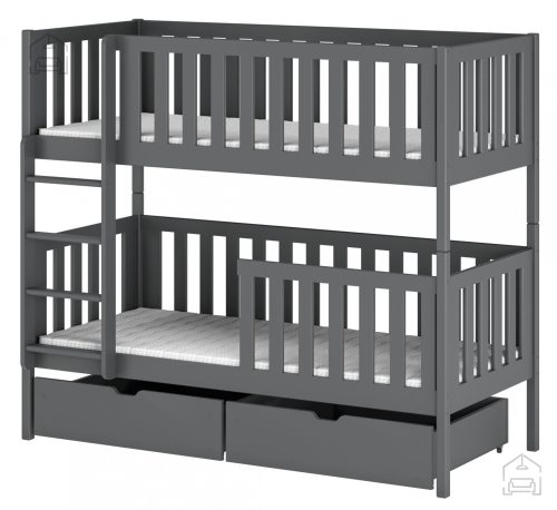 Sodobna otroška postelja z dodatnim ležiščem je namenjena fantom in deklicam. Otroška postelja je narejena tako, da združuje funkcionalnost, modernost in predvsem kakovost in varnost za vašega otroka, ker ima močen okvir iz bora. Praktične dimenzije zagotavljajo, da postelja ne zasede veliko prostora, zato je več prostora za igranje ali učenje. Otroška postelja je narejena iz borovega lesa. Postelja ima prostor za shranjevanje v obliki dveh predalov. | Material: laminirana plošča