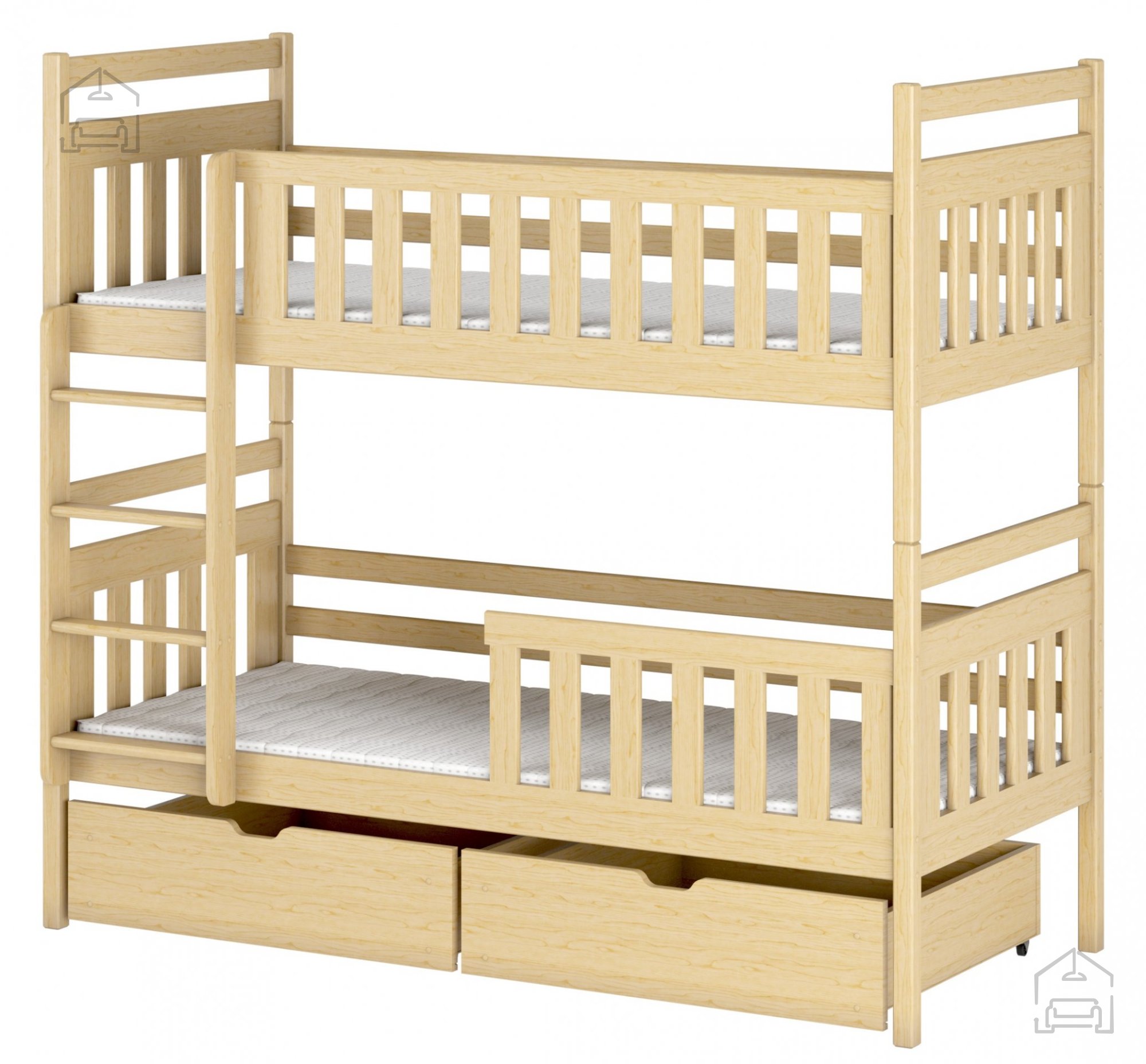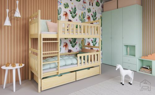 Sodobna otroška postelja z dodatnim ležiščem je namenjena fantom in deklicam. Otroška postelja je narejena tako, da združuje funkcionalnost, modernost in predvsem kakovost in varnost za vašega otroka, ker ima močen okvir iz bora. Praktične dimenzije zagotavljajo, da postelja ne zasede veliko prostora, zato je več prostora za igranje ali učenje. Otroška postelja je narejena iz borovega lesa. Postelja ima prostor za shranjevanje v obliki dveh predalov.