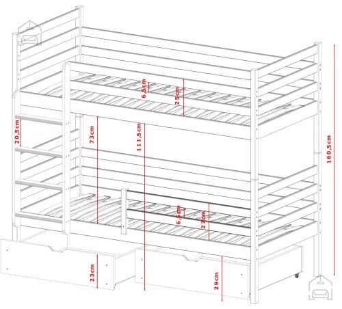 Sodobna otroška postelja z dodatnim ležiščem je namenjena fantom in deklicam. Otroška postelja je narejena tako, da združuje funkcionalnost, modernost in predvsem kakovost in varnost za vašega otroka, ker ima močen okvir iz bora. Praktične dimenzije zagotavljajo, da postelja ne zasede veliko prostora, zato je več prostora za igranje ali učenje. Otroška postelja je narejena iz borovega lesa. Postelja ima prostor za shranjevanje v obliki dveh predalov. | Material: tkanina, les