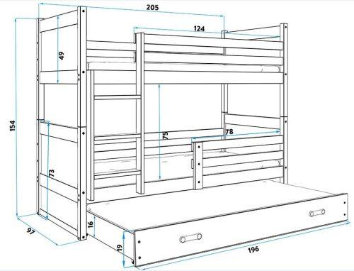 Sodobna otroška postelja z dodatnim ležiščem je namenjena fantom in deklicam. Otroška postelja je narejena tako, da združuje funkcionalnost, modernost in predvsem kakovost in varnost za vašega otroka, ker ima močen okvir iz bora. Praktične dimenzije zagotavljajo, da postelja ne zasede veliko prostora, zato je več prostora za igranje ali učenje. Otroška postelja je narejena iz borovega lesa. Postelja ima prostor za shranjevanje v obliki dveh predalov. | Ležalna površina: 90x200 cm