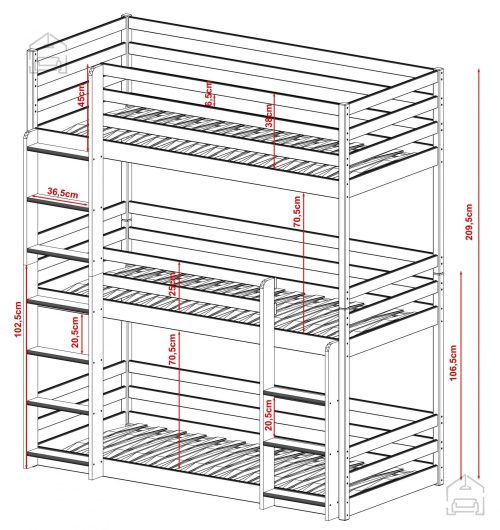 Vzmetnica ni vključena v cenoDimenzije: 970x2095x2080 mm Otroške sobe so pogosto izziv za starše, saj morajo združevati prostor za igro, učenje in počitek. Pograd Ted je popolna kombinacija vsega tega, s tremi spalnimi nivoji, ki ponujajo optimalno izrabo prostora. Pograd Ted je popolna rešitev za družine z več otroki.