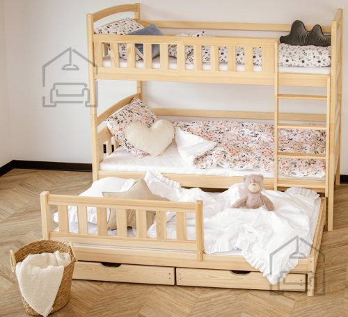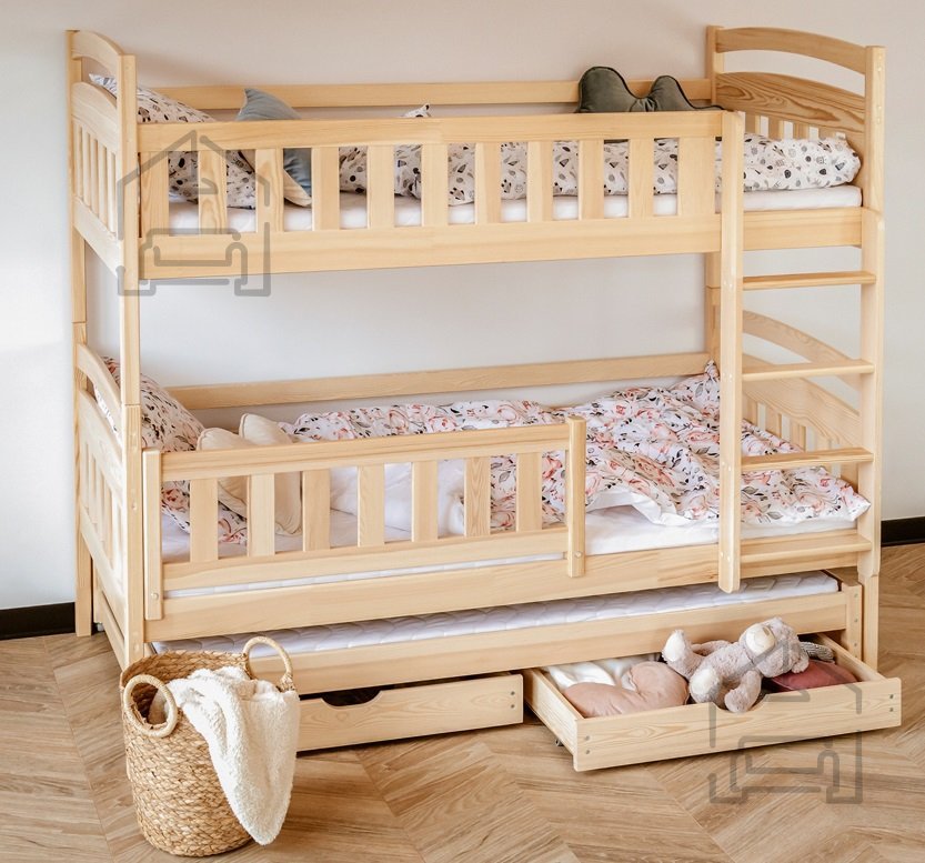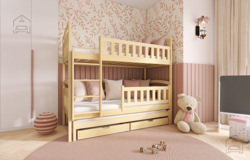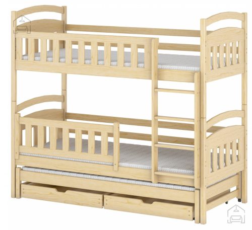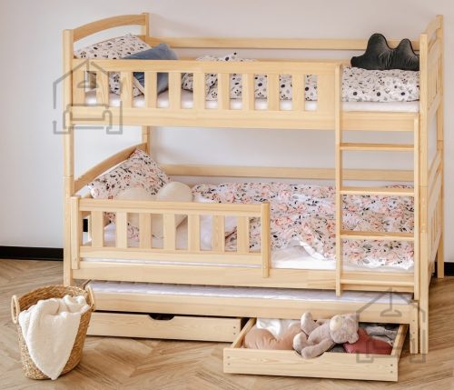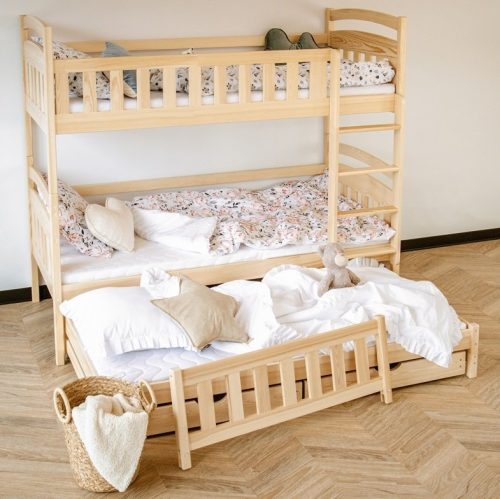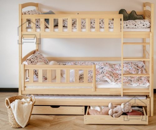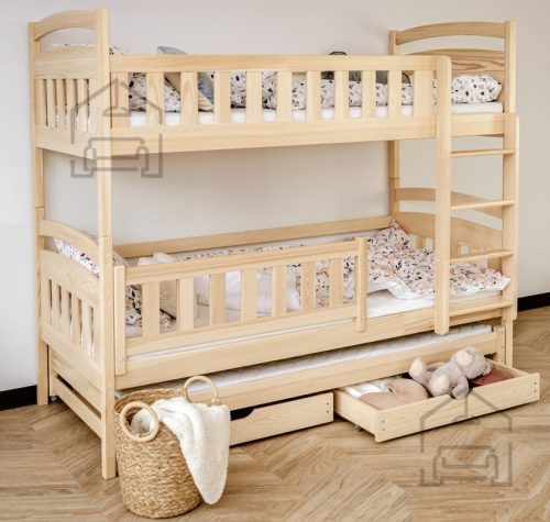 Sodobna otroška postelja z dodatnim ležiščem je namenjena fantom in deklicam. Otroška postelja je narejena tako, da združuje funkcionalnost, modernost in predvsem kakovost in varnost za vašega otroka, ker ima močen okvir iz bora. Praktične dimenzije zagotavljajo, da postelja ne zasede veliko prostora, zato je več prostora za igranje ali učenje. Otroška postelja je narejena iz borovega lesa. Postelja ima prostor za shranjevanje v obliki dveh predalov. | Material: laminirana plošča
