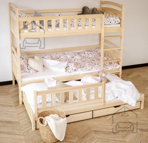 Sodobna otroška postelja z dodatnim ležiščem je namenjena fantom in deklicam. Otroška postelja je narejena tako, da združuje funkcionalnost, modernost in predvsem kakovost in varnost za vašega otroka, ker ima močen okvir iz bora. Praktične dimenzije zagotavljajo, da postelja ne zasede veliko prostora, zato je več prostora za igranje ali učenje. Otroška postelja je narejena iz borovega lesa. Postelja ima prostor za shranjevanje v obliki dveh predalov. | Ležalna površina: 75x180 cm