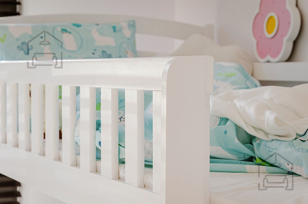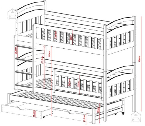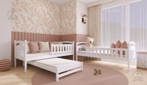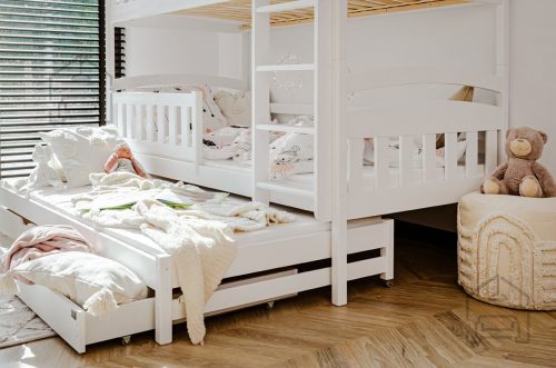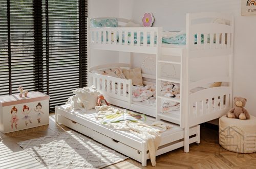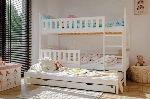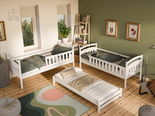 Sodobna otroška postelja z dodatnim ležiščem je namenjena fantom in deklicam. Otroška postelja je narejena tako, da združuje funkcionalnost, modernost in predvsem kakovost in varnost za vašega otroka, ker ima močen okvir iz bora. Praktične dimenzije zagotavljajo, da postelja ne zasede veliko prostora, zato je več prostora za igranje ali učenje. Otroška postelja je narejena iz borovega lesa. Postelja ima prostor za shranjevanje v obliki dveh predalov.