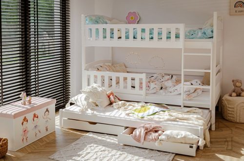 • Dodatna prostornost pograda Blanka je dosežena z izvlečnimi predali na dnu postelje, ki nudijo idealno rešitev za shranjevanje igrač, odej in drugih dragocenih predmetov. Material za predale, izdelan iz iverne plošče, je trpežen in odporen, zagotavlja pa, da se dragocenosti shranjujejo varno, brez deformacij ali poškodb.