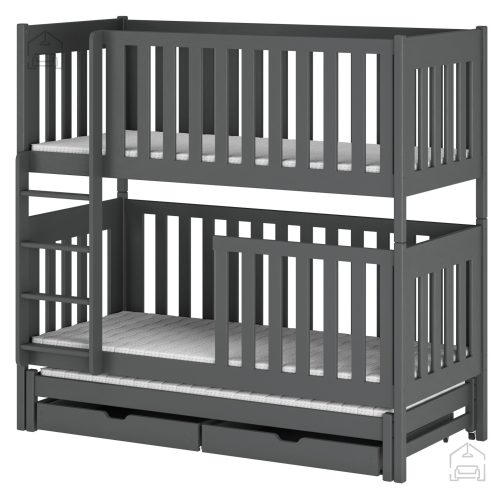 Sodobna otroška postelja z dodatnim ležiščem je namenjena fantom in deklicam. Otroška postelja je narejena tako, da združuje funkcionalnost, modernost in predvsem kakovost in varnost za vašega otroka, ker ima močen okvir iz bora. Praktične dimenzije zagotavljajo, da postelja ne zasede veliko prostora, zato je več prostora za igranje ali učenje. Otroška postelja je narejena iz borovega lesa. Postelja ima prostor za shranjevanje v obliki dveh predalov. | Material: laminirana iverna plošča, 16 mm