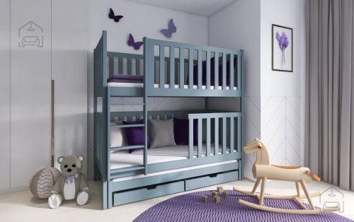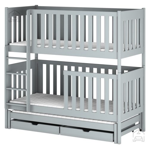 Sodobna otroška postelja z dodatnim ležiščem je namenjena fantom in deklicam. Otroška postelja je narejena tako, da združuje funkcionalnost, modernost in predvsem kakovost in varnost za vašega otroka, ker ima močen okvir iz bora. Praktične dimenzije zagotavljajo, da postelja ne zasede veliko prostora, zato je več prostora za igranje ali učenje. Otroška postelja je narejena iz borovega lesa. Postelja ima prostor za shranjevanje v obliki dveh predalov. | Material: tkanina/masiven les