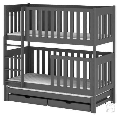Sodobna otroška postelja z dodatnim ležiščem je namenjena fantom in deklicam. Otroška postelja je narejena tako, da združuje funkcionalnost, modernost in predvsem kakovost in varnost za vašega otroka, ker ima močen okvir iz bora. Praktične dimenzije zagotavljajo, da postelja ne zasede veliko prostora, zato je več prostora za igranje ali učenje. Otroška postelja je narejena iz borovega lesa. Postelja ima prostor za shranjevanje v obliki dveh predalov. | Material: tkanina/masiven les