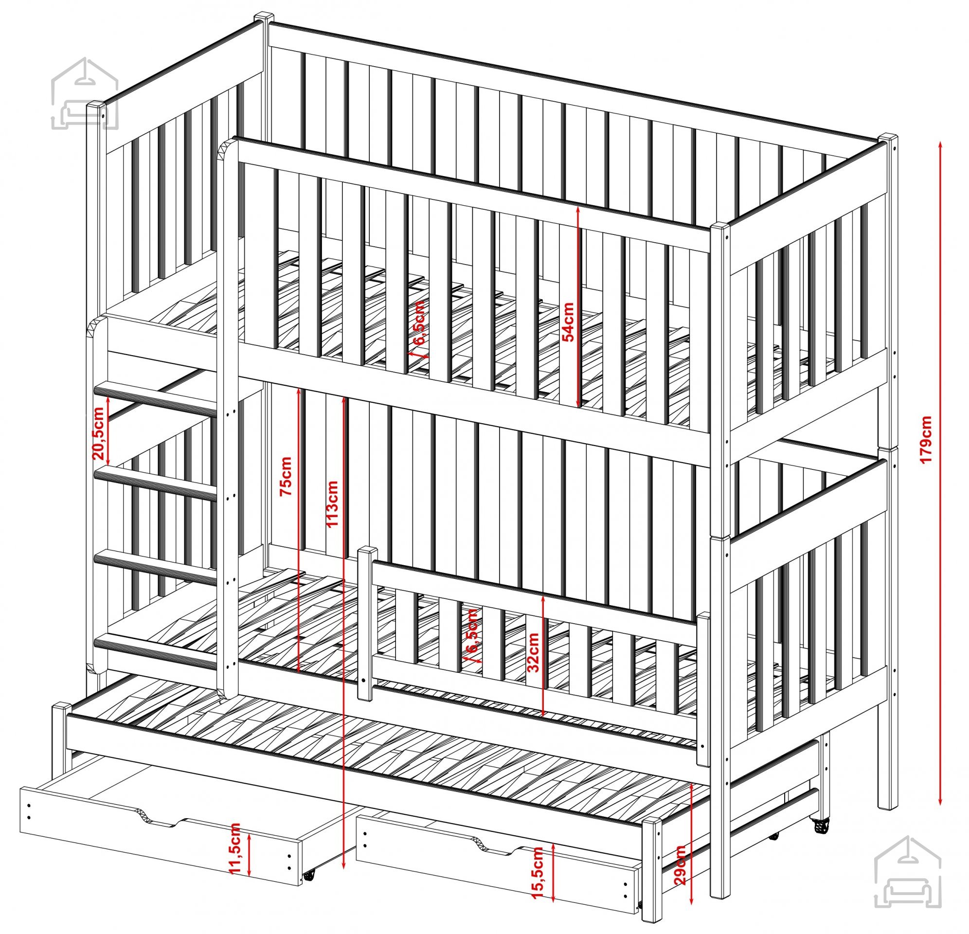 Sodobna otroška postelja z dodatnim ležiščem je namenjena fantom in deklicam. Otroška postelja je narejena tako, da združuje funkcionalnost, modernost in predvsem kakovost in varnost za vašega otroka, ker ima močen okvir iz bora. Praktične dimenzije zagotavljajo, da postelja ne zasede veliko prostora, zato je več prostora za igranje ali učenje. Otroška postelja je narejena iz borovega lesa. Postelja ima prostor za shranjevanje v obliki dveh predalov. | Material: les, kovina Barva: višnja/črnaDimenzije: 1660x1060x2060 mm Moderno oblikovana postelja Viera je odlična izbira za vsako spalnico. | Material: laminirana plošča
