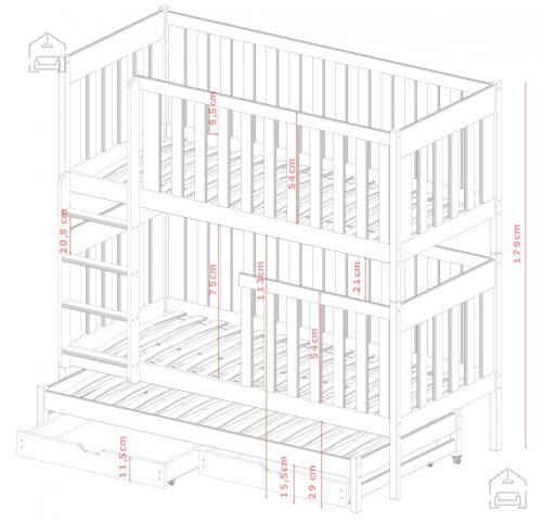 Vzmetnica ni vključena v cenoDimenzije: 870x1790x1680 mm Pograd z dodatnim ležiščem Emilka je izjemno premišljen kos pohištva, namenjen sorojencem, ki si delijo eno sobo. Sestavljen je iz dveh nivojev in dodatnega izvlečnega podesta z vzmetnico, ki se čez dan lahko skrije in ne zavzame prostora v sobi, ponoči pa omogoča udoben spanec tretjemu otroku. To vam omogoča optimalno izrabo prostora v otroški sobi.