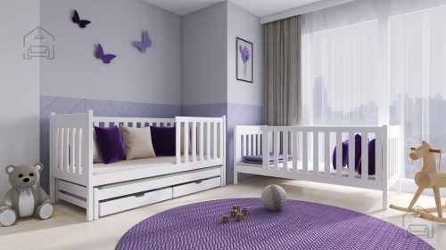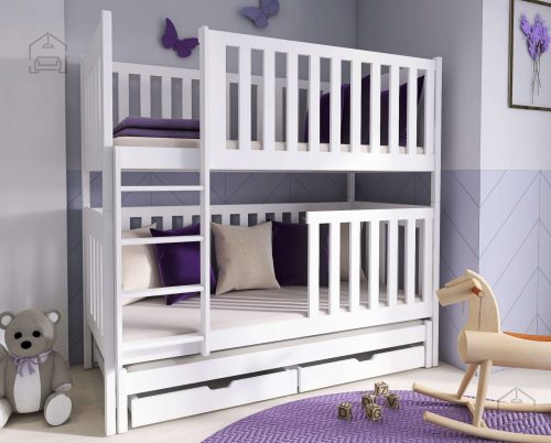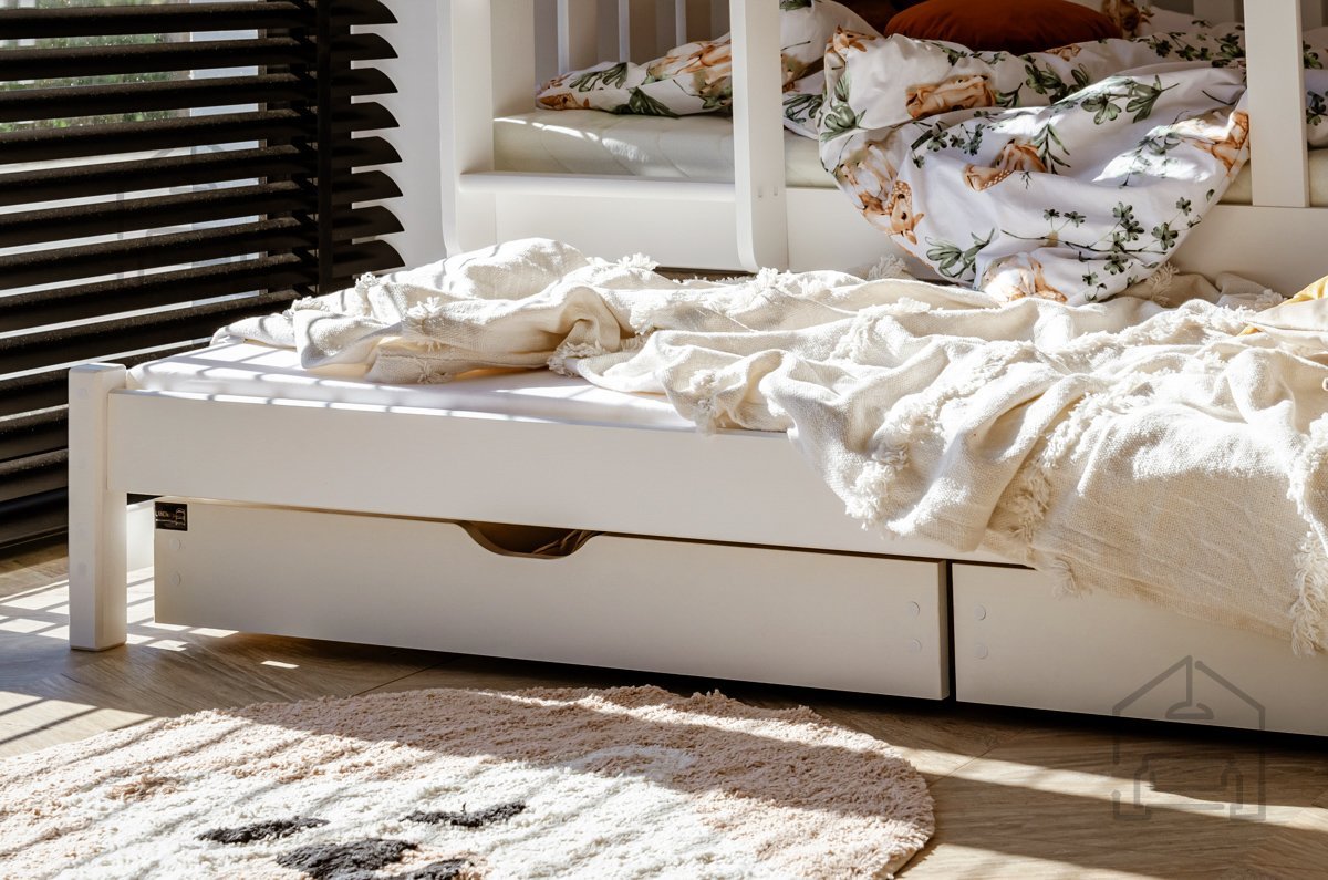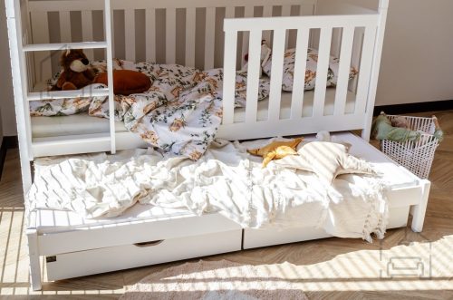 Sodobna otroška postelja z dodatnim ležiščem je namenjena fantom in deklicam. Otroška postelja je narejena tako, da združuje funkcionalnost, modernost in predvsem kakovost in varnost za vašega otroka, ker ima močen okvir iz bora. Praktične dimenzije zagotavljajo, da postelja ne zasede veliko prostora, zato je več prostora za igranje ali učenje. Otroška postelja je narejena iz borovega lesa. Postelja ima prostor za shranjevanje v obliki dveh predalov. | Ležalna površina: 160x200 cm
