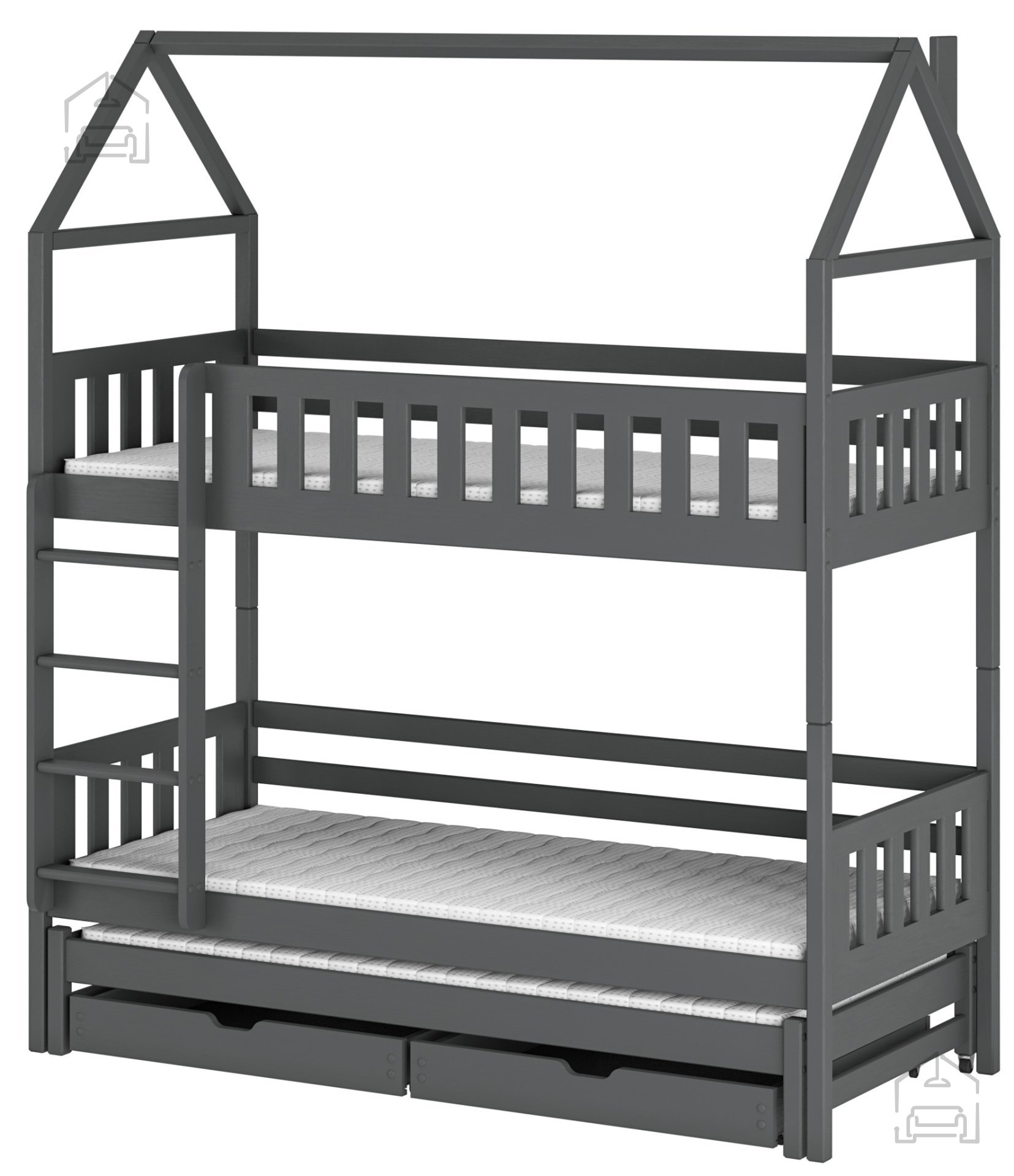 Sodobna otroška postelja z dodatnim ležiščem je namenjena fantom in deklicam. Otroška postelja je narejena tako, da združuje funkcionalnost, modernost in predvsem kakovost in varnost za vašega otroka, ker ima močen okvir iz bora. Praktične dimenzije zagotavljajo, da postelja ne zasede veliko prostora, zato je več prostora za igranje ali učenje. Otroška postelja je narejena iz borovega lesa. Postelja ima prostor za shranjevanje v obliki dveh predalov. | Material: Iveral 16 mm Barva: kathult + sivaDimenzije: 1700x900x420 mm