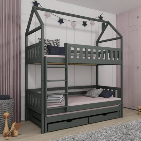 Pograd Iga je zasnovan tako, da združuje estetski videz in funkcionalnost. S svojo kompaktno velikostjo 97x198x217 cm in elegantnim sivim odtenkom se brez težav prilega v vsak prostor. Glavna ležalna površina meri 90x190 cm, kar zagotavlja udobno spanje za vaše otroke ali goste. Dva priročna predala pod posteljo ponujata dodaten prostor za shranjevanje posteljnine ali drugih osebnih predmetov, kar vam pomaga ohranjati red in čistočo.