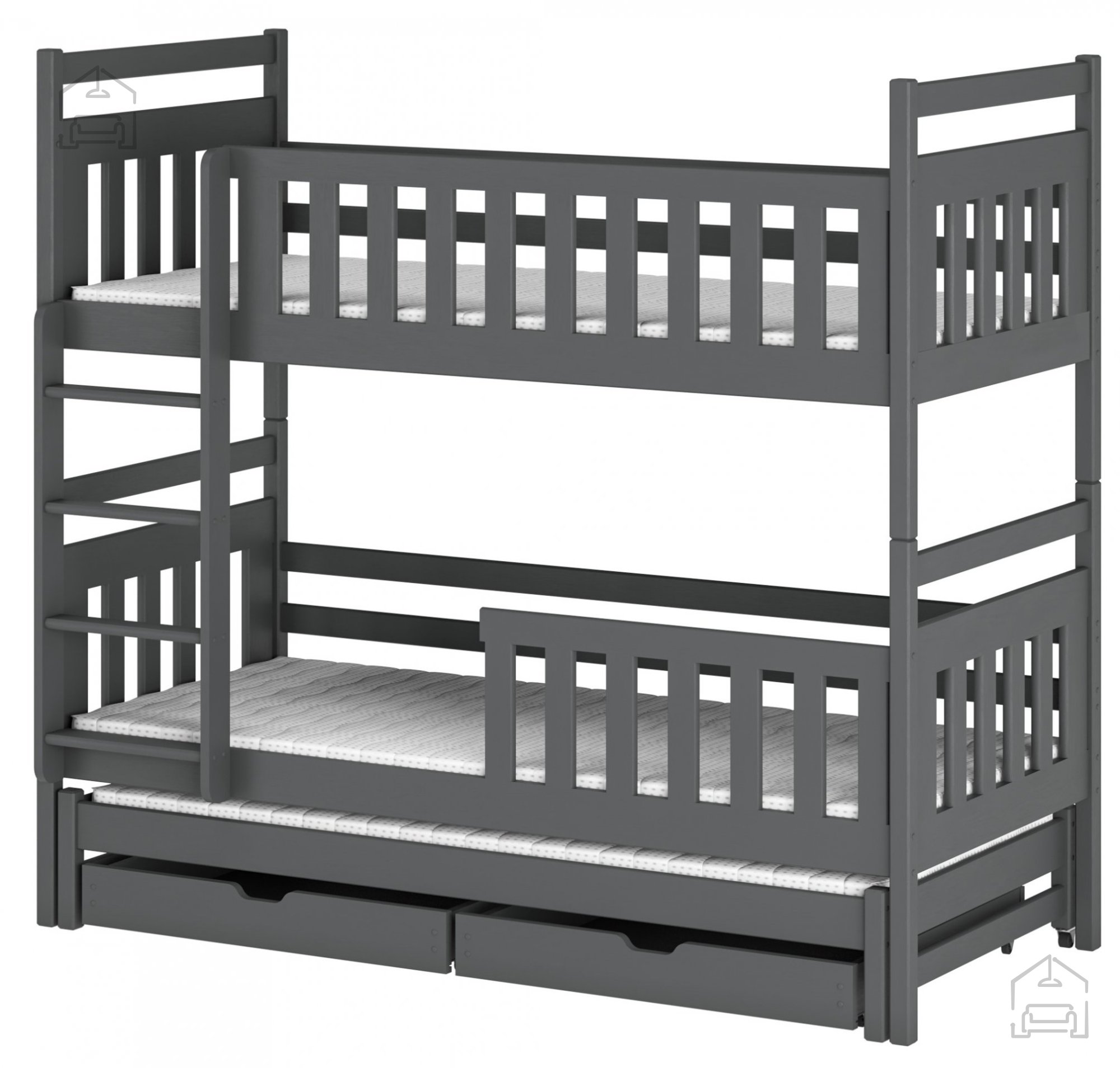 Sodobna otroška postelja z dodatnim ležiščem je namenjena fantom in deklicam. Otroška postelja je narejena tako, da združuje funkcionalnost, modernost in predvsem kakovost in varnost za vašega otroka, ker ima močen okvir iz bora. Praktične dimenzije zagotavljajo, da postelja ne zasede veliko prostora, zato je več prostora za igranje ali učenje. Otroška postelja je narejena iz borovega lesa. Postelja ima prostor za shranjevanje v obliki dveh predalov. | Material: tkanina, les