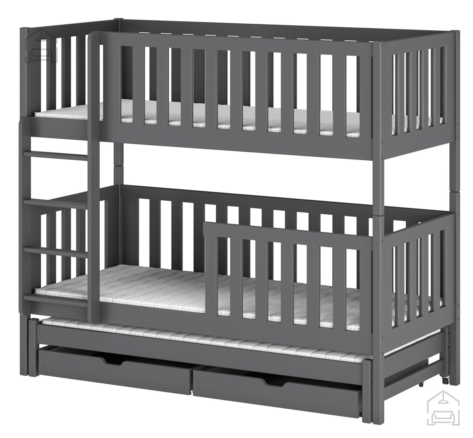 Sodobna otroška postelja z dodatnim ležiščem je namenjena fantom in deklicam. Otroška postelja je narejena tako, da združuje funkcionalnost, modernost in predvsem kakovost in varnost za vašega otroka, ker ima močen okvir iz bora. Praktične dimenzije zagotavljajo, da postelja ne zasede veliko prostora, zato je več prostora za igranje ali učenje. Otroška postelja je narejena iz borovega lesa. Postelja ima prostor za shranjevanje v obliki dveh predalov. | Ležalna površina: 90x200 cm