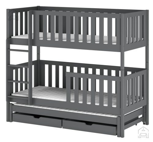 Sodobna otroška postelja z dodatnim ležiščem je namenjena fantom in deklicam. Otroška postelja je narejena tako, da združuje funkcionalnost, modernost in predvsem kakovost in varnost za vašega otroka, ker ima močen okvir iz bora. Praktične dimenzije zagotavljajo, da postelja ne zasede veliko prostora, zato je več prostora za igranje ali učenje. Otroška postelja je narejena iz borovega lesa. Postelja ima prostor za shranjevanje v obliki dveh predalov. | Material: Iveral