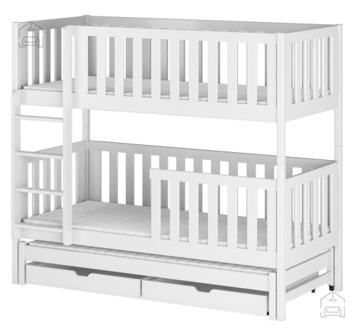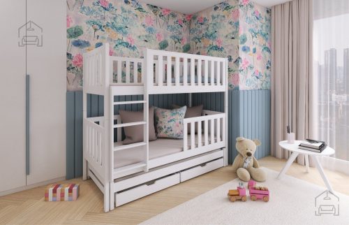 Sodobna otroška postelja z dodatnim ležiščem je namenjena fantom in deklicam. Otroška postelja je narejena tako, da združuje funkcionalnost, modernost in predvsem kakovost in varnost za vašega otroka, ker ima močen okvir iz bora. Praktične dimenzije zagotavljajo, da postelja ne zasede veliko prostora, zato je več prostora za igranje ali učenje. Otroška postelja je narejena iz borovega lesa. Postelja ima prostor za shranjevanje v obliki dveh predalov. | Material korpusa: Laminirana plošča