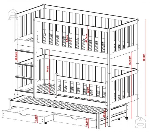 Sodobna otroška postelja z dodatnim ležiščem je namenjena fantom in deklicam. Otroška postelja je narejena tako, da združuje funkcionalnost, modernost in predvsem kakovost in varnost za vašega otroka, ker ima močen okvir iz bora. Praktične dimenzije zagotavljajo, da postelja ne zasede veliko prostora, zato je več prostora za igranje ali učenje. Otroška postelja je narejena iz borovega lesa. Postelja ima prostor za shranjevanje v obliki dveh predalov. | Ležalna površina: 75x180 cm