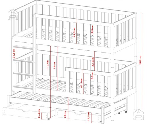 Sodobna otroška postelja z dodatnim ležiščem je namenjena fantom in deklicam. Otroška postelja je narejena tako, da združuje funkcionalnost, modernost in predvsem kakovost in varnost za vašega otroka, ker ima močen okvir iz bora. Praktične dimenzije zagotavljajo, da postelja ne zasede veliko prostora, zato je več prostora za igranje ali učenje. Otroška postelja je narejena iz borovega lesa. Postelja ima prostor za shranjevanje v obliki dveh predalov. | Material: laminirana iverna plošča, 16 mm