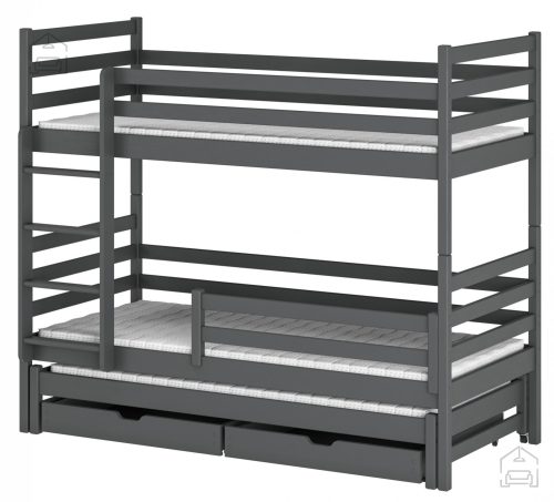 Sodobna otroška postelja z dodatnim ležiščem je namenjena fantom in deklicam. Otroška postelja je narejena tako, da združuje funkcionalnost, modernost in predvsem kakovost in varnost za vašega otroka, ker ima močen okvir iz bora. Praktične dimenzije zagotavljajo, da postelja ne zasede veliko prostora, zato je več prostora za igranje ali učenje. Otroška postelja je narejena iz borovega lesa. Postelja ima prostor za shranjevanje v obliki dveh predalov. | Ležalna površina: 90x200 cm