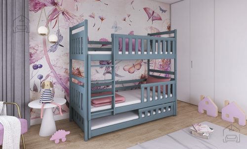 Sodobna otroška postelja z dodatnim ležiščem je namenjena fantom in deklicam. Otroška postelja je narejena tako, da združuje funkcionalnost, modernost in predvsem kakovost in varnost za vašega otroka, ker ima močen okvir iz bora. Praktične dimenzije zagotavljajo, da postelja ne zasede veliko prostora, zato je več prostora za igranje ali učenje. Otroška postelja je narejena iz borovega lesa. Postelja ima prostor za shranjevanje v obliki dveh predalov. | Ležalna površina: 160x200 cm