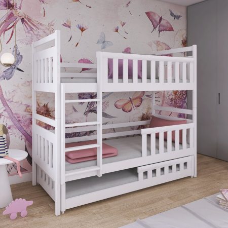 Sodobna otroška postelja z dodatnim ležiščem je namenjena fantom in deklicam. Otroška postelja je narejena tako, da združuje funkcionalnost, modernost in predvsem kakovost in varnost za vašega otroka, ker ima močen okvir iz bora. Praktične dimenzije zagotavljajo, da postelja ne zasede veliko prostora, zato je več prostora za igranje ali učenje. Otroška postelja je narejena iz borovega lesa. Postelja ima prostor za shranjevanje v obliki dveh predalov. | Material: laminirana plošča