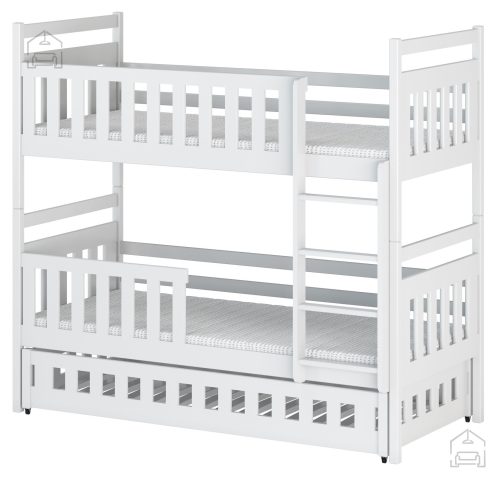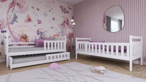 Sodobna otroška postelja z dodatnim ležiščem je namenjena fantom in deklicam. Otroška postelja je narejena tako, da združuje funkcionalnost, modernost in predvsem kakovost in varnost za vašega otroka, ker ima močen okvir iz bora. Praktične dimenzije zagotavljajo, da postelja ne zasede veliko prostora, zato je več prostora za igranje ali učenje. Otroška postelja je narejena iz borovega lesa. Postelja ima prostor za shranjevanje v obliki dveh predalov. | Material: Iverna plošča, MDF