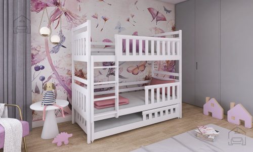 Sodobna otroška postelja z dodatnim ležiščem je namenjena fantom in deklicam. Otroška postelja je narejena tako, da združuje funkcionalnost, modernost in predvsem kakovost in varnost za vašega otroka, ker ima močen okvir iz bora. Praktične dimenzije zagotavljajo, da postelja ne zasede veliko prostora, zato je več prostora za igranje ali učenje. Otroška postelja je narejena iz borovega lesa. Postelja ima prostor za shranjevanje v obliki dveh predalov. | Material: laminirana plošča