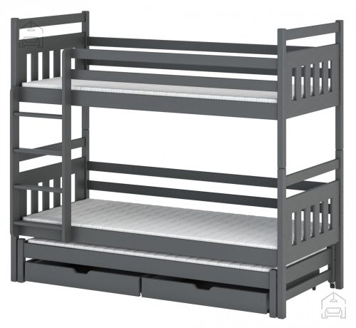 Sodobna otroška postelja z dodatnim ležiščem je namenjena fantom in deklicam. Otroška postelja je narejena tako, da združuje funkcionalnost, modernost in predvsem kakovost in varnost za vašega otroka, ker ima močen okvir iz bora. Praktične dimenzije zagotavljajo, da postelja ne zasede veliko prostora, zato je več prostora za igranje ali učenje. Otroška postelja je narejena iz borovega lesa. Postelja ima prostor za shranjevanje v obliki dveh predalov.