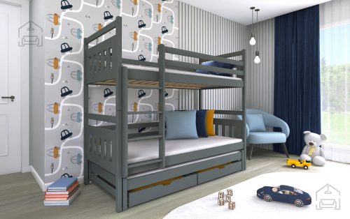 Sodobna otroška postelja z dodatnim ležiščem je namenjena fantom in deklicam. Otroška postelja je narejena tako, da združuje funkcionalnost, modernost in predvsem kakovost in varnost za vašega otroka, ker ima močen okvir iz bora. Praktične dimenzije zagotavljajo, da postelja ne zasede veliko prostora, zato je več prostora za igranje ali učenje. Otroška postelja je narejena iz borovega lesa. Postelja ima prostor za shranjevanje v obliki dveh predalov. | Material: Iverna plošča, MDF